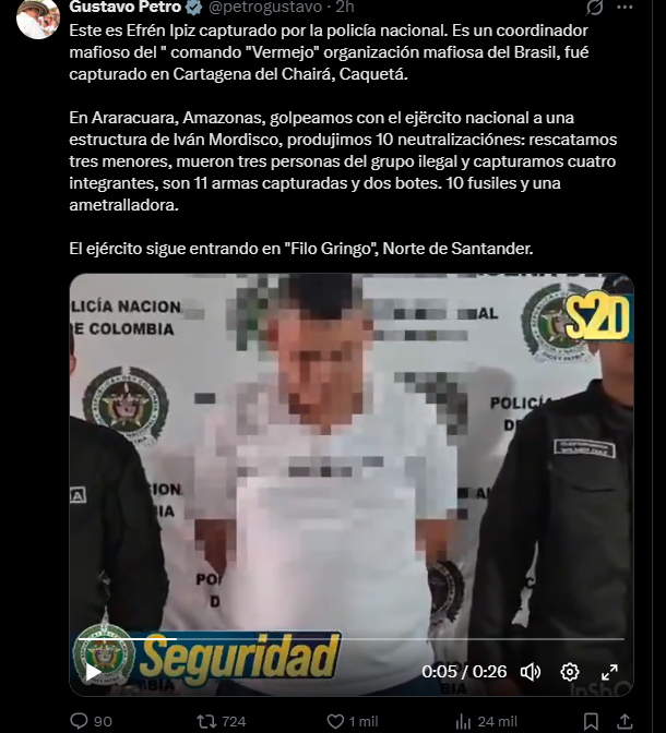 “Este es Efrén Ipiz capturado por la Policía Nacional. Es un coordinador mafioso del ‘Comando Vermelho’, organización mafiosa del Brasil”, escribió Petro en su publicación.
