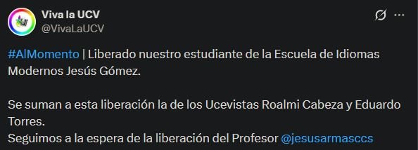 “Liberado nuestro estudiante de la Escuela de Idiomas Modernos Jesús Gómez. Se suman a esta liberación la de los Ucevistas Roalmi Cabeza y Eduardo Torres. Seguimos a la espera de la liberación del Profesor Jesús Armas”, escribió la organización estudiantil.