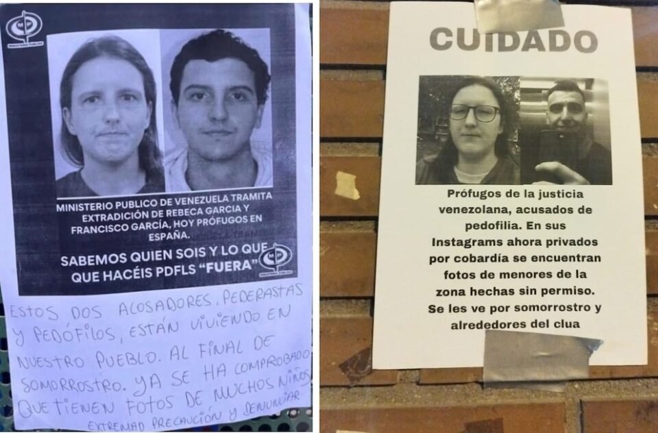 “Como muchos de vosotros ya sabéis, se ha descubierto en nuestra comunidad la presencia de un individuo que junto a su hermana se dedican a acosar y sacar fotos a los niños y a los demás vecinos para luego subirlas a sus redes sociales plagadas de fotos con sustancias ilegales y símbolos asociados a la pedofilia. Tienen antecedentes penales y una solicitud de extradición vigente emitida por las autoridades venezolana por difundir material pornográfico infantil. Mediante este comunicado se intenta avisar a los vecinos que todavía no están al tanto de la gravísima situación, que tengan muchísimo cuidado y, sobre todo, que vigilen muy bien a los niños y que denuncien a la policía de inmediato si detectan a estos personajes acercándose a ellos”, reza uno de los carteles colgados.